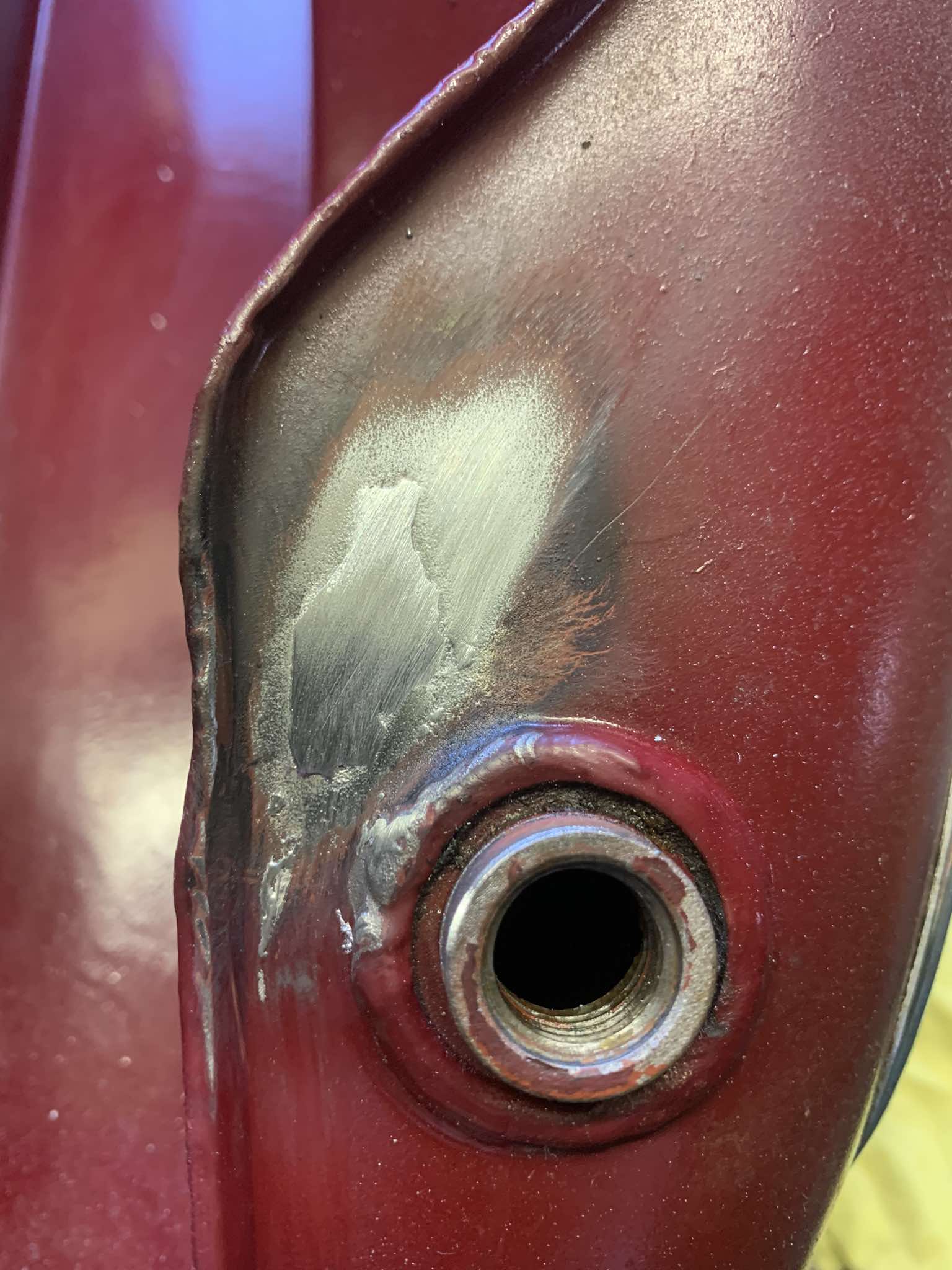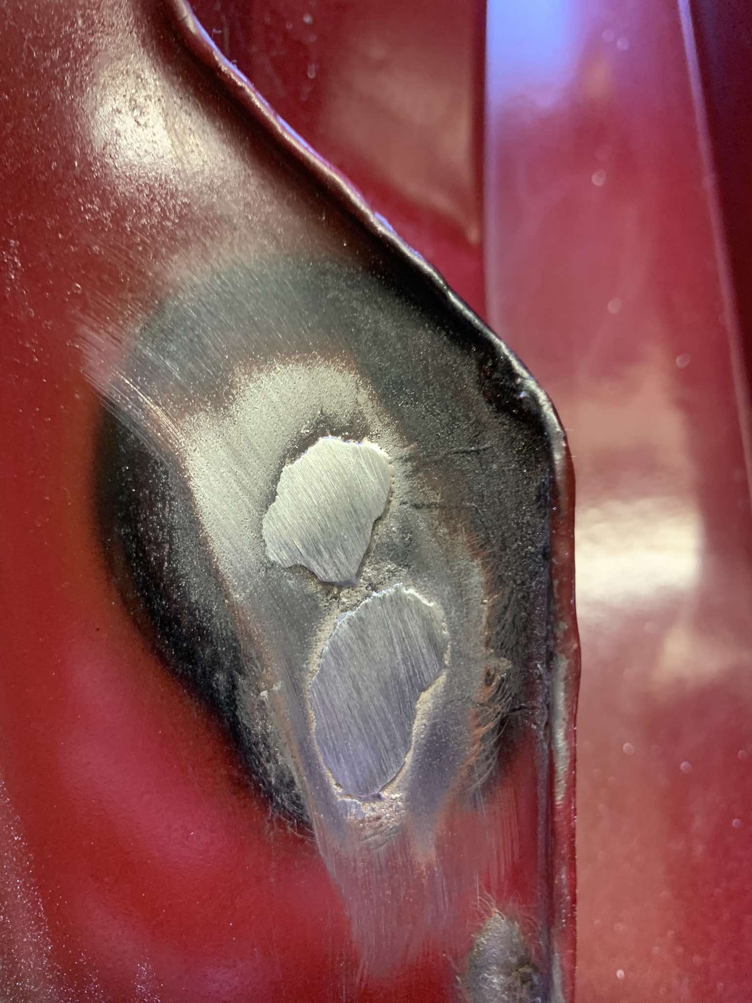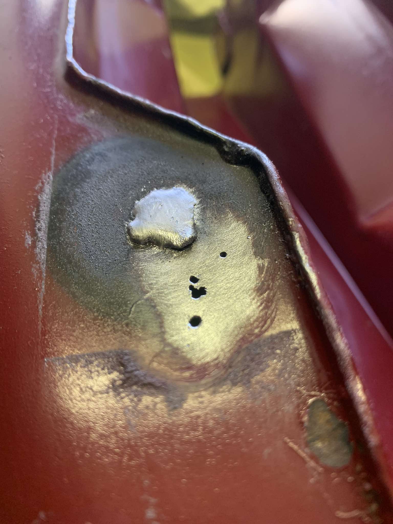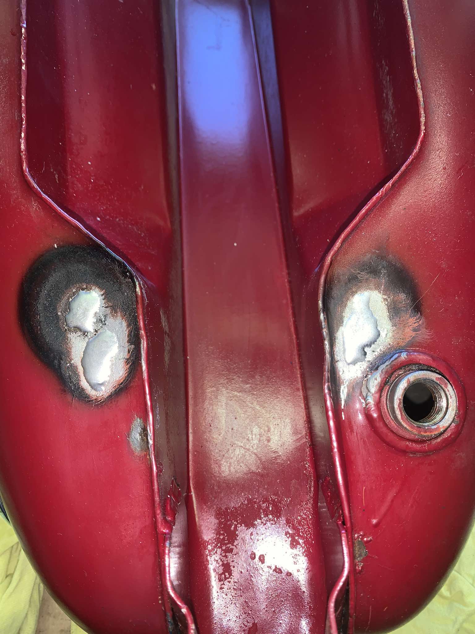 Zadání od zákazníka znělo jasně: Opravit nádrž jednoduše a s co nejmenším poškozením původního laku. Z původních 3 děr se vyklubala rozsáhlejší akce. Nádrž byla prorezlá na několika místech a proto jsme se vydali cestou zacínování. Po domluvě se zákazníkem byl cín pouze lehce zbroušen, aby si to zachovalo silnější vrstvu materiálu v poškozeném místě. Opravu laku si bude dělat zákazník sám.