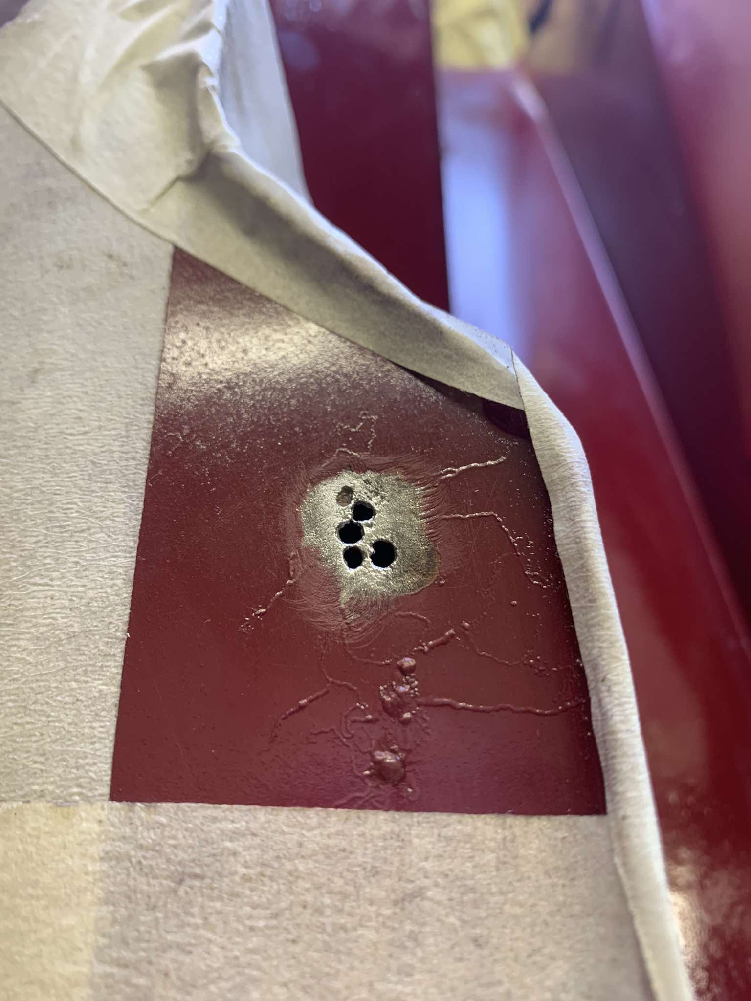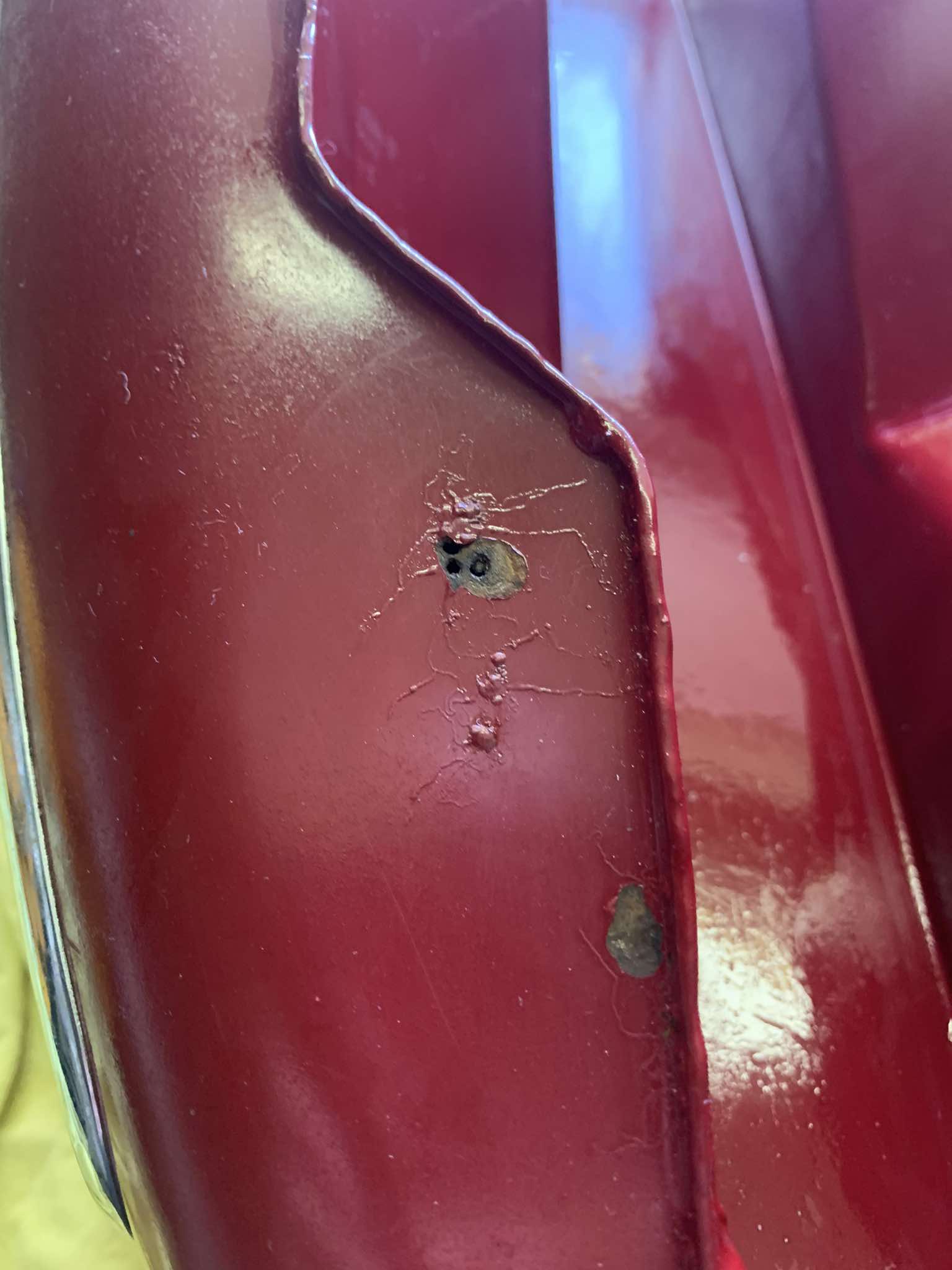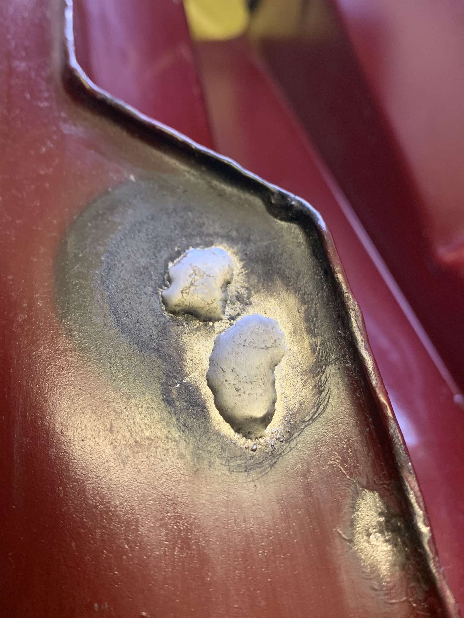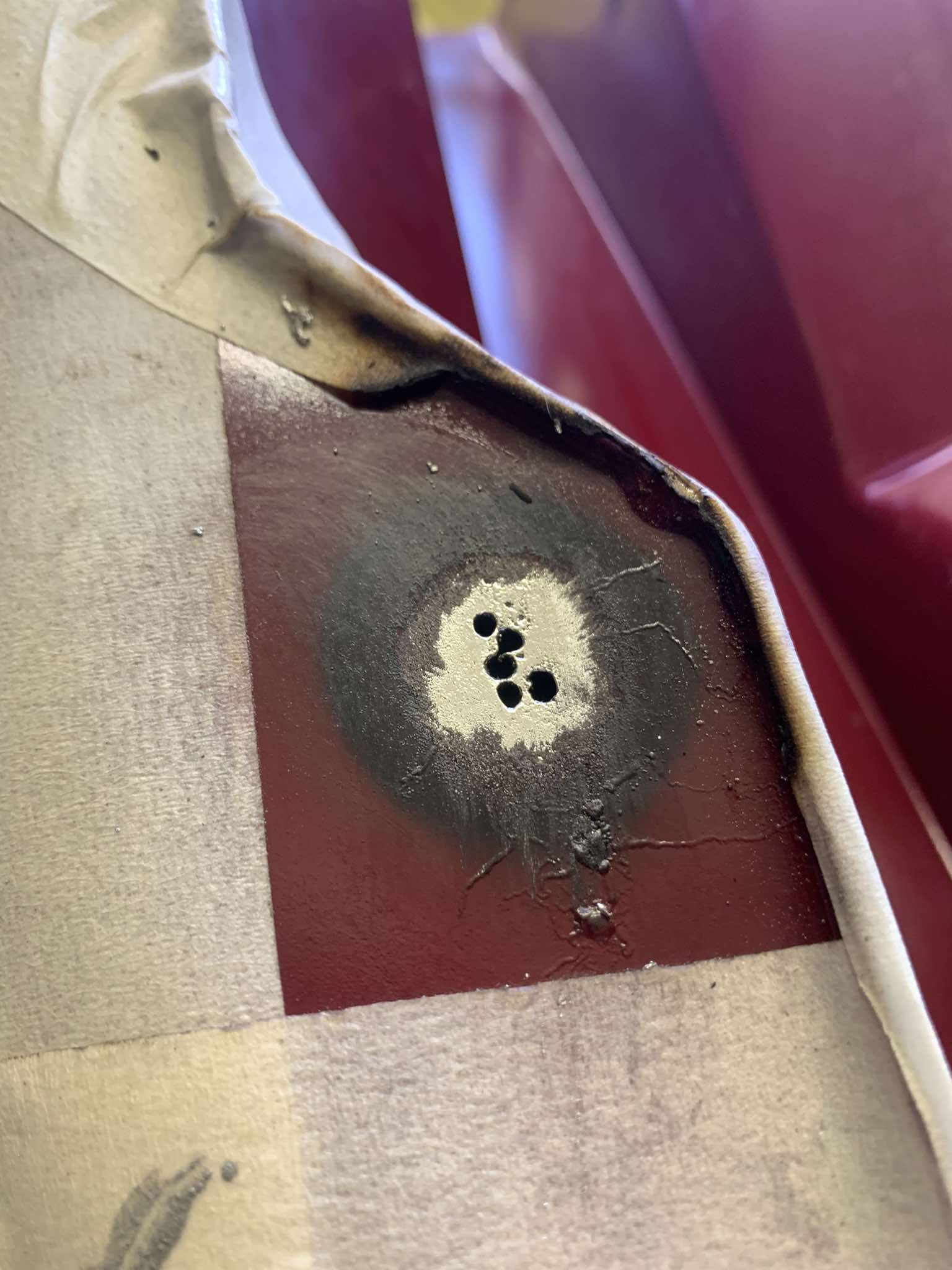 Zadání od zákazníka znělo jasně: Opravit nádrž jednoduše a s co nejmenším poškozením původního laku. Z původních 3 děr se vyklubala rozsáhlejší akce. Nádrž byla prorezlá na několika místech a proto jsme se vydali cestou zacínování. Po domluvě se zákazníkem byl cín pouze lehce zbroušen, aby si to zachovalo silnější vrstvu materiálu v poškozeném místě. Opravu laku si bude dělat zákazník sám.