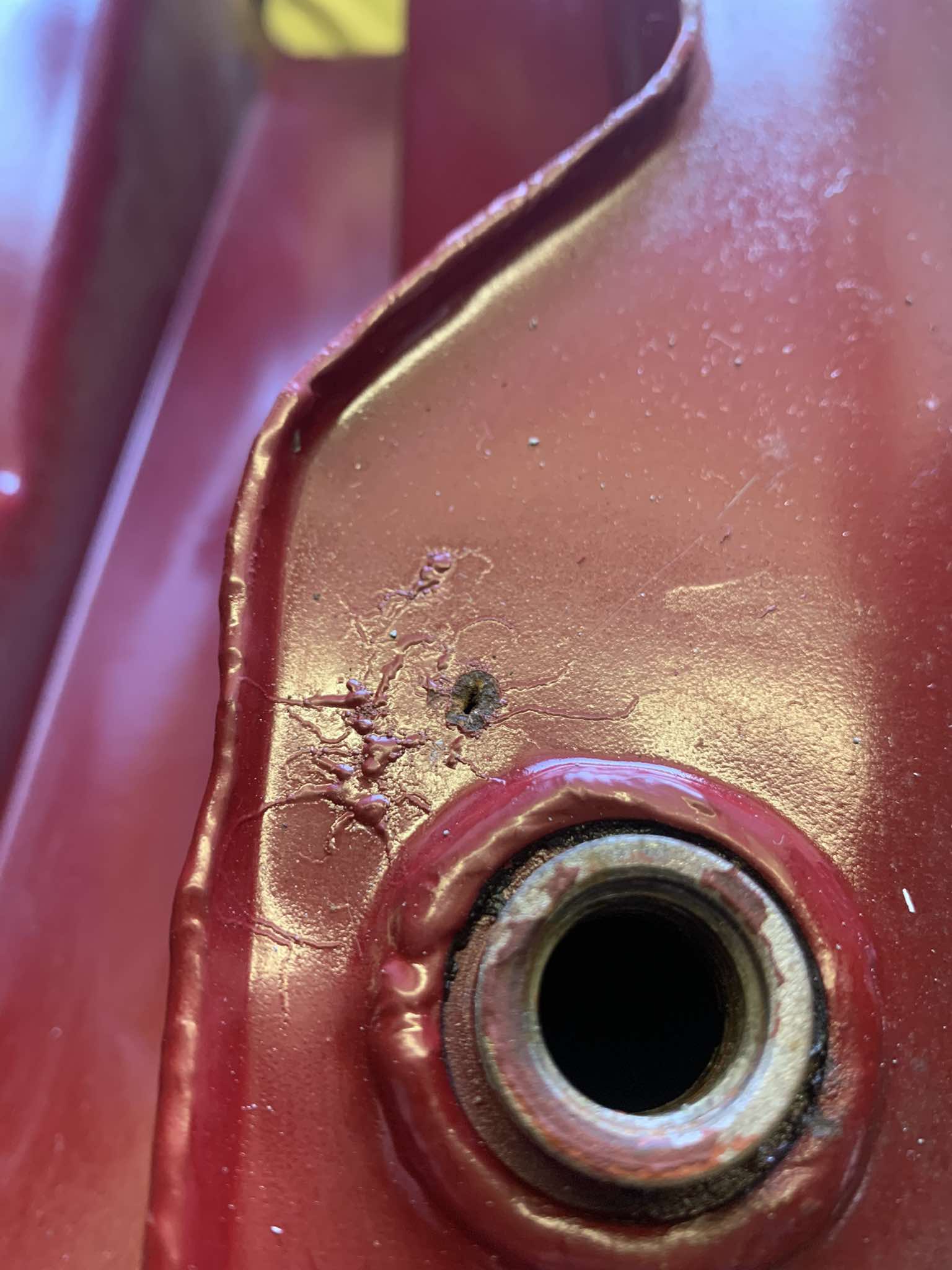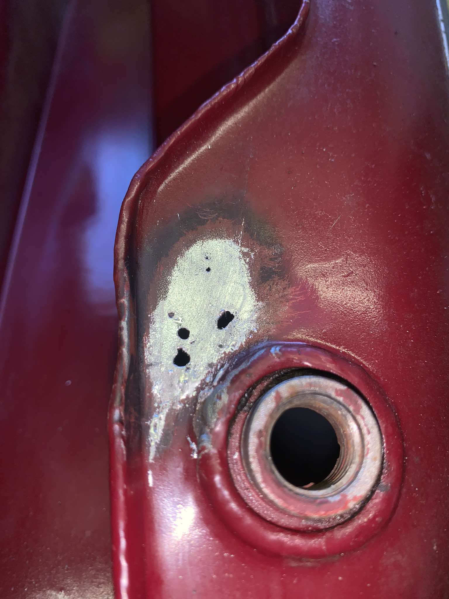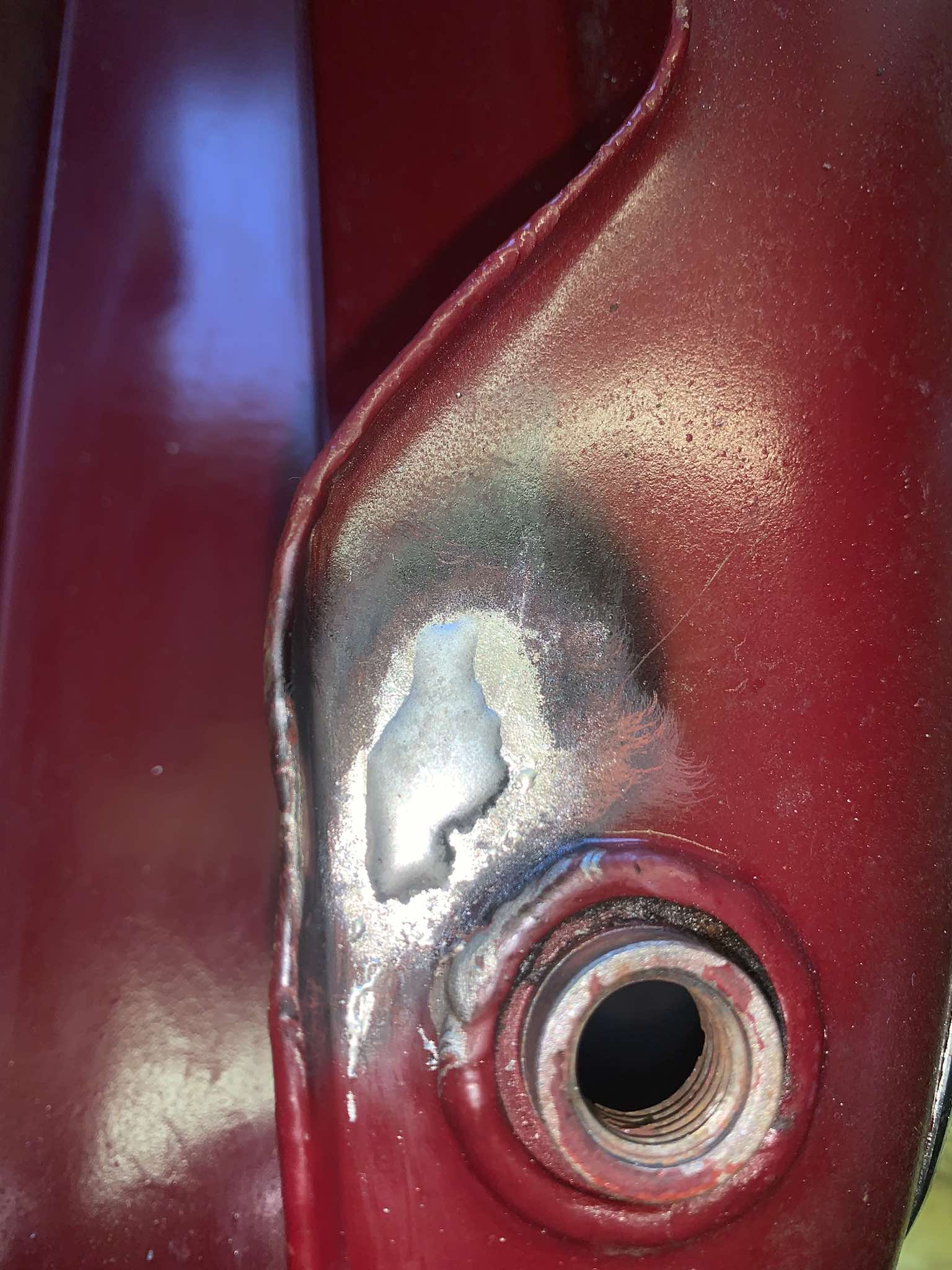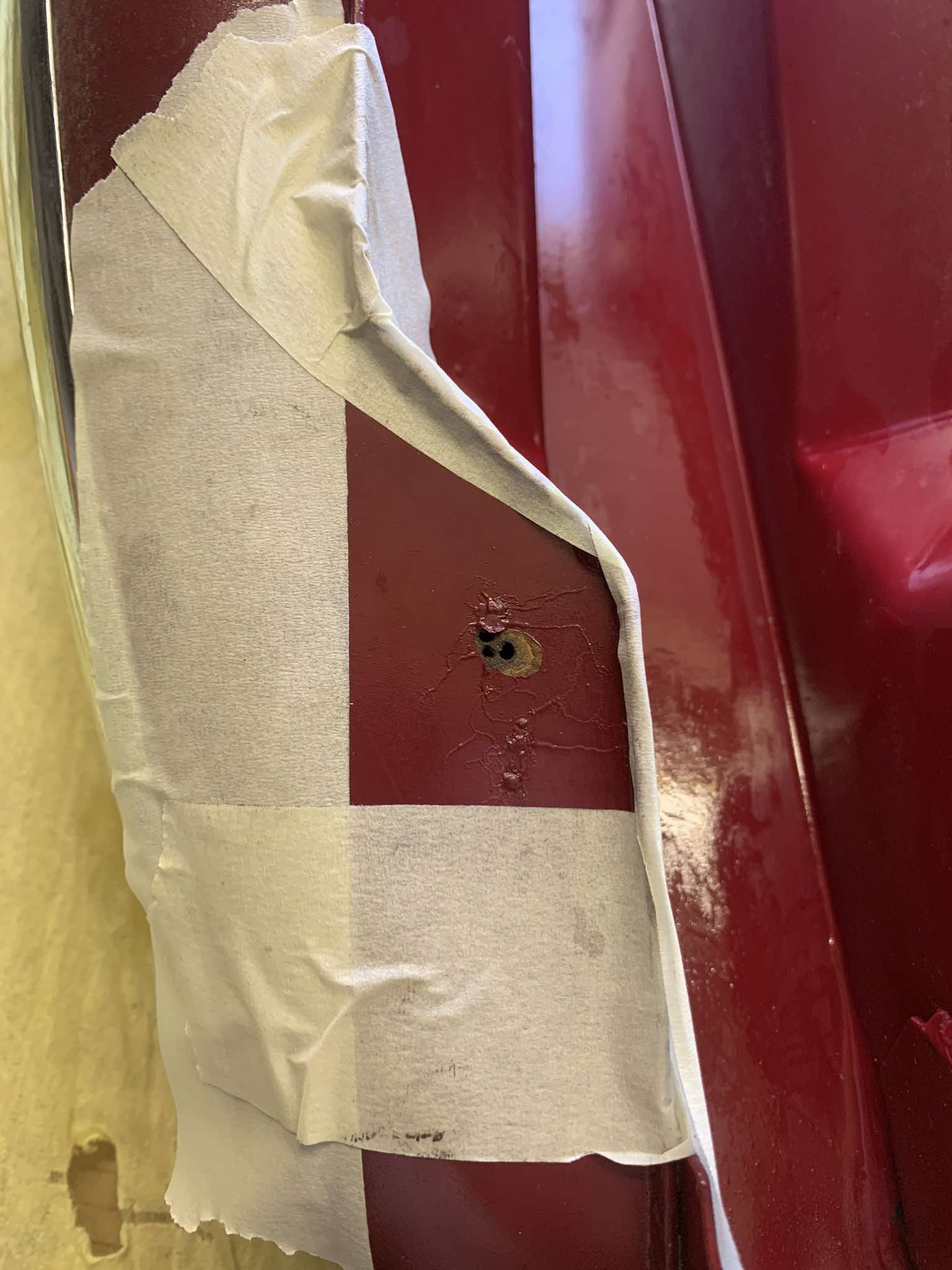 Zadání od zákazníka znělo jasně: Opravit nádrž jednoduše a s co nejmenším poškozením původního laku. Z původních 3 děr se vyklubala rozsáhlejší akce. Nádrž byla prorezlá na několika místech a proto jsme se vydali cestou zacínování. Po domluvě se zákazníkem byl cín pouze lehce zbroušen, aby si to zachovalo silnější vrstvu materiálu v poškozeném místě. Opravu laku si bude dělat zákazník sám.