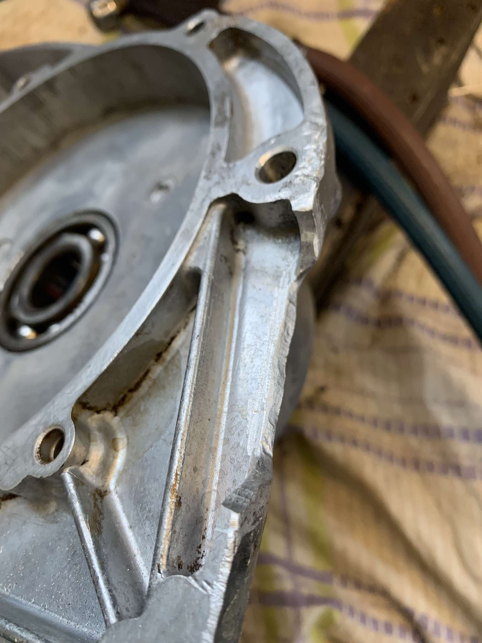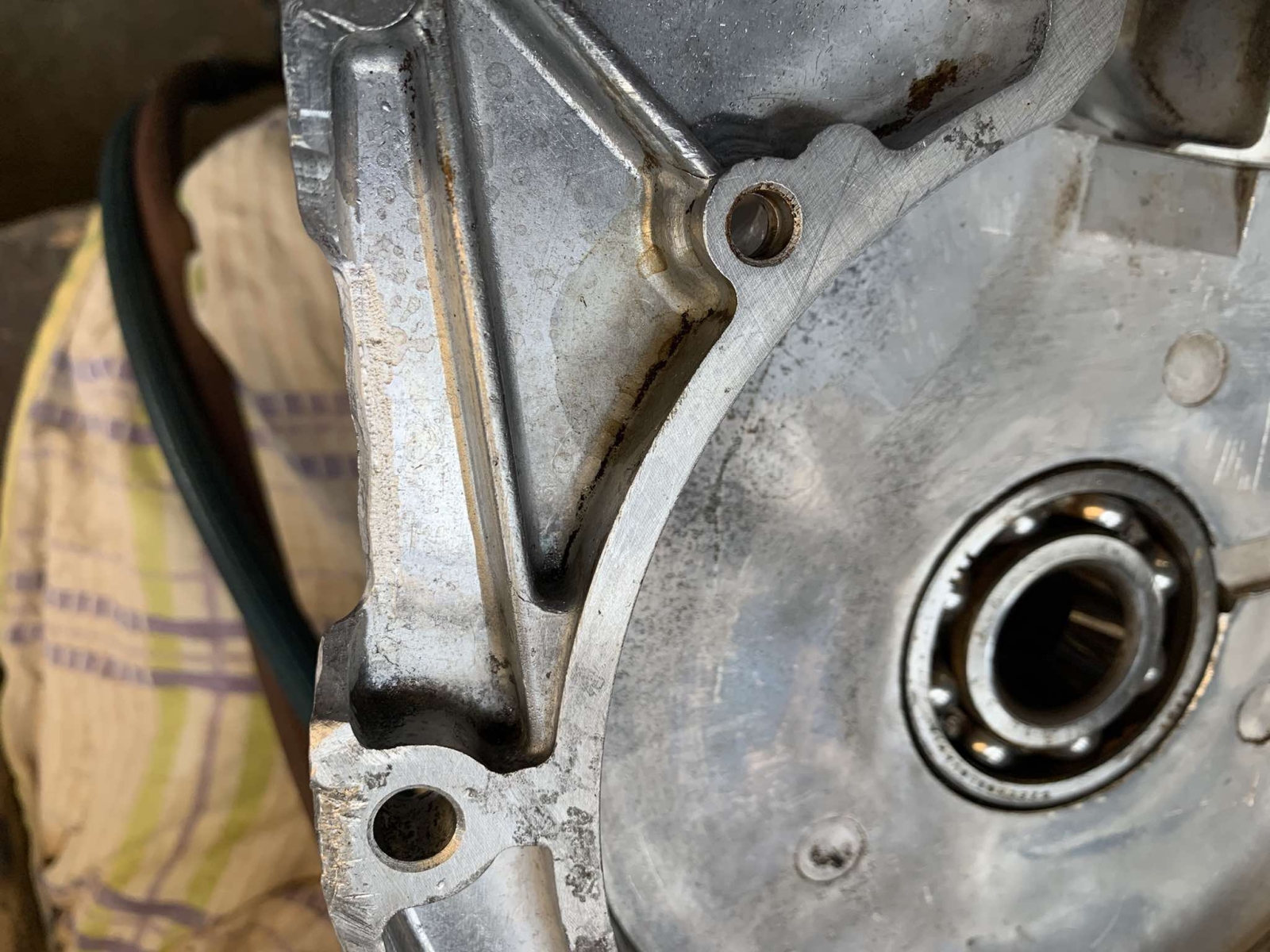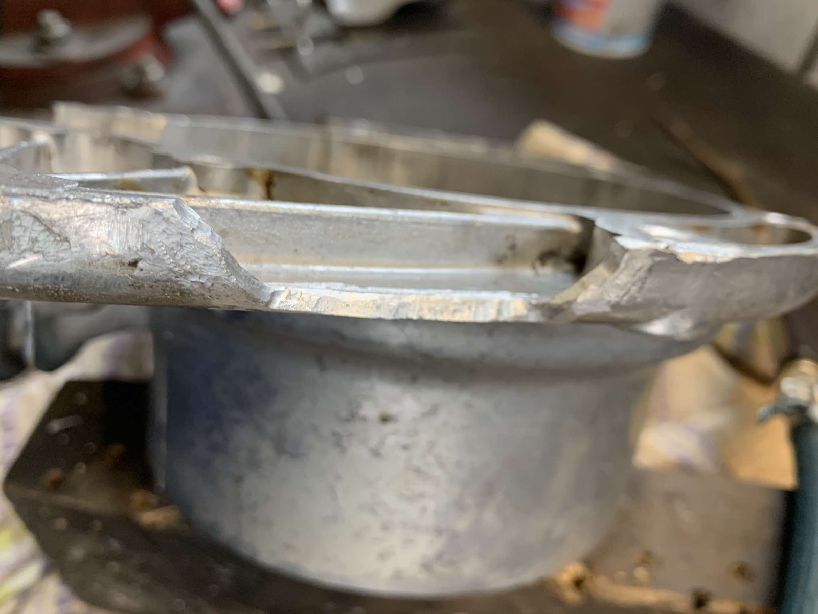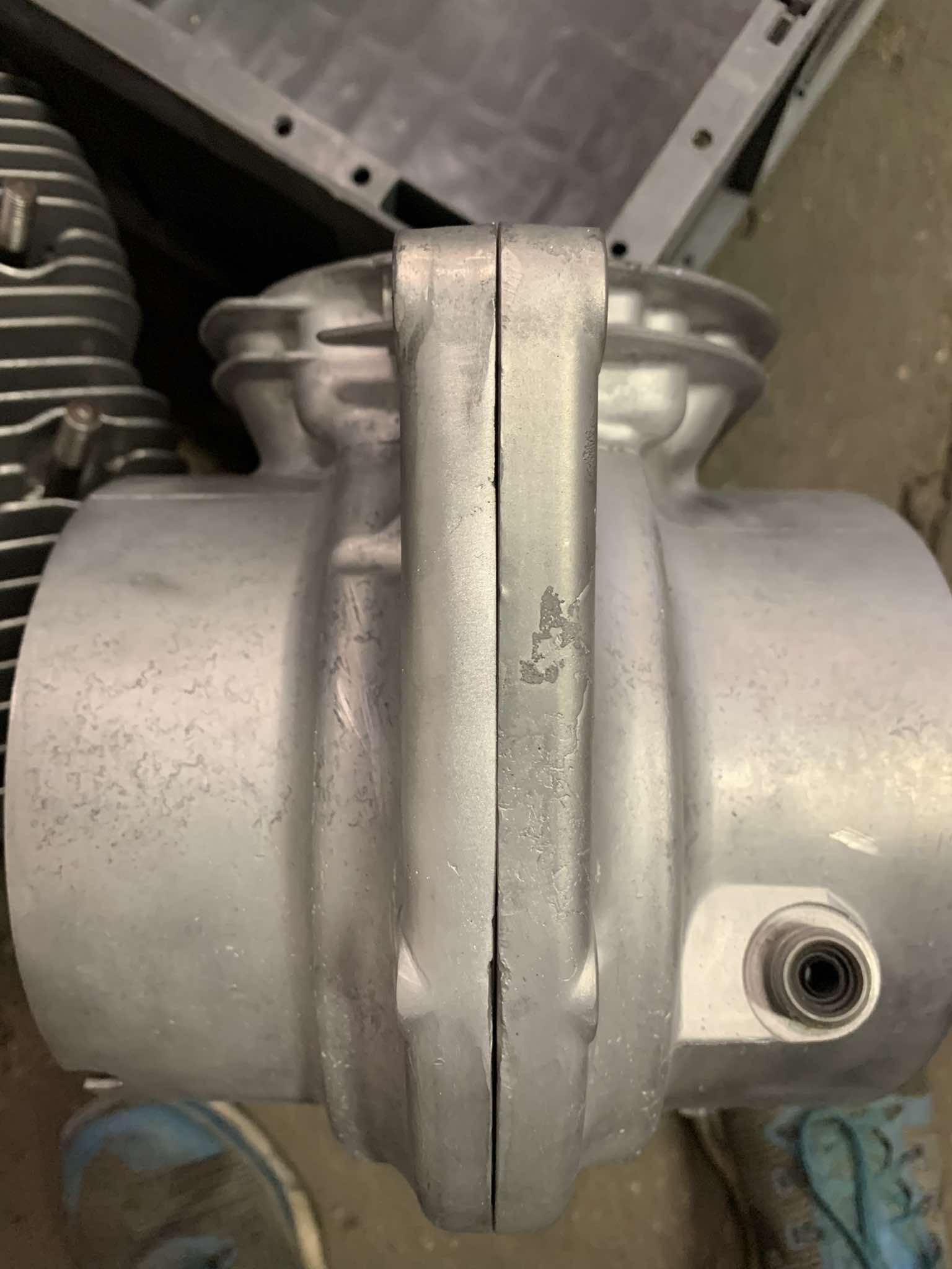 Na bloku motoru byl ulomen přední kus karteru po snaze o neodborné rozpůlení motoru šroubovákem. S majitelkem balo domluveno, že na spoji karterů zůstane o milimetr více materiálu a on si karter srovná do roviny.